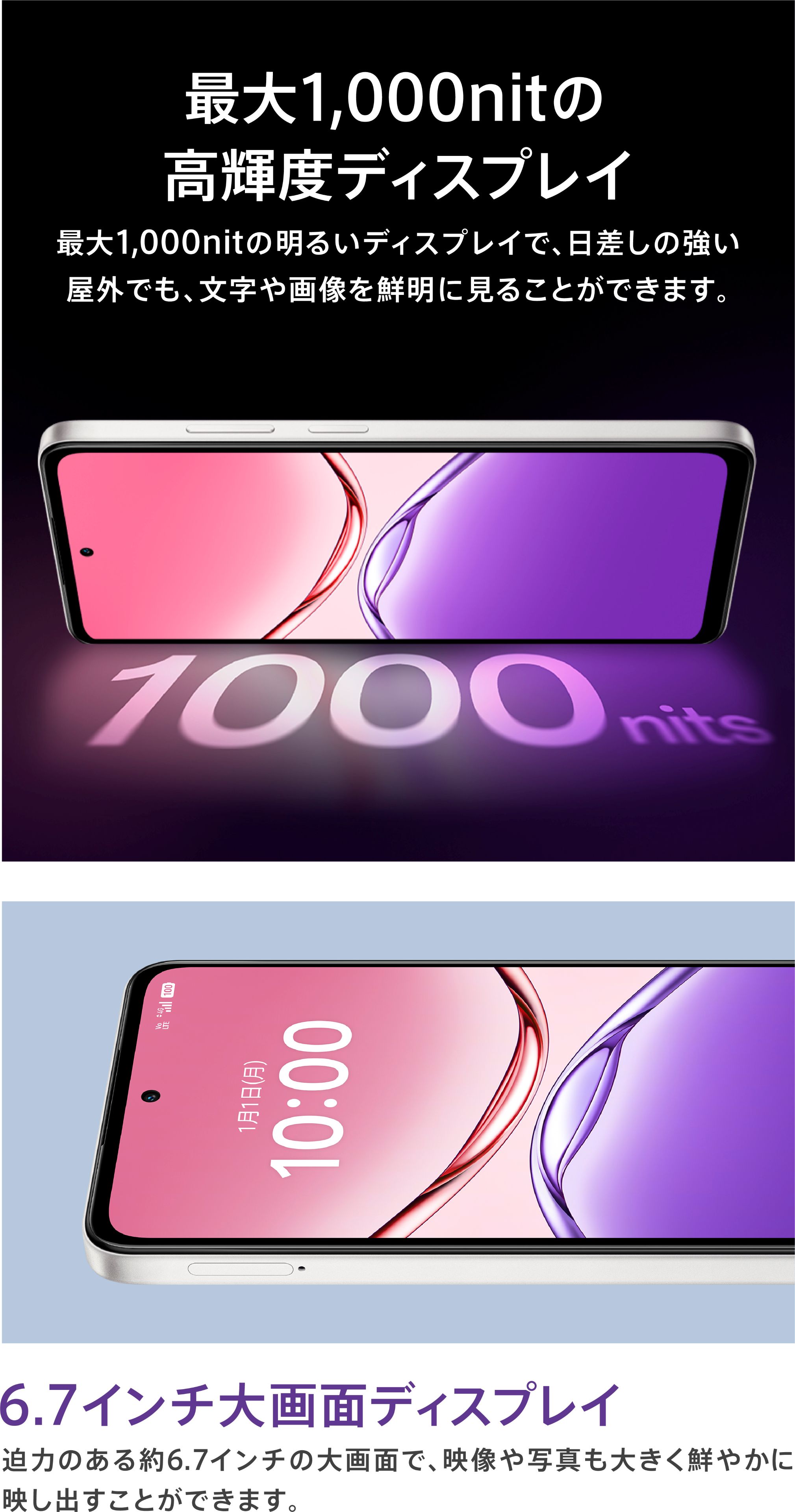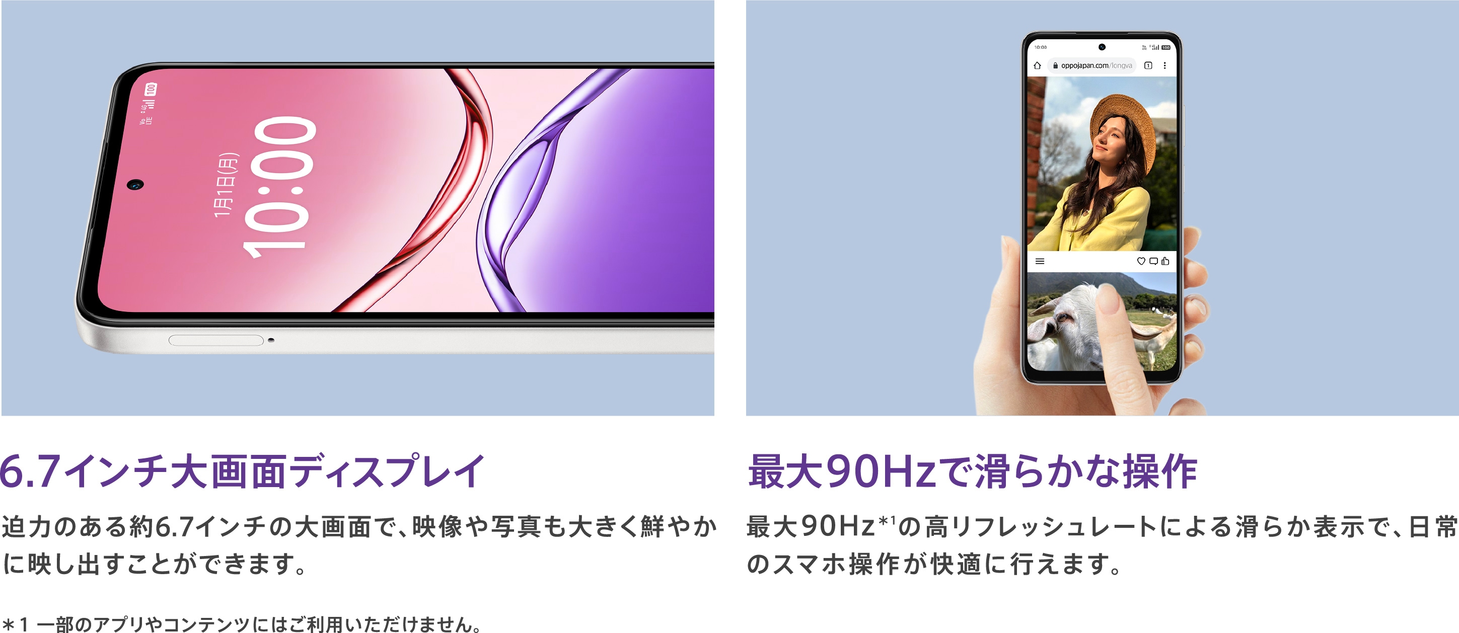 | ディスプレイ | 約6.7インチ/HD+(1,604×720)/ リフレッシュレート最大90Hz |