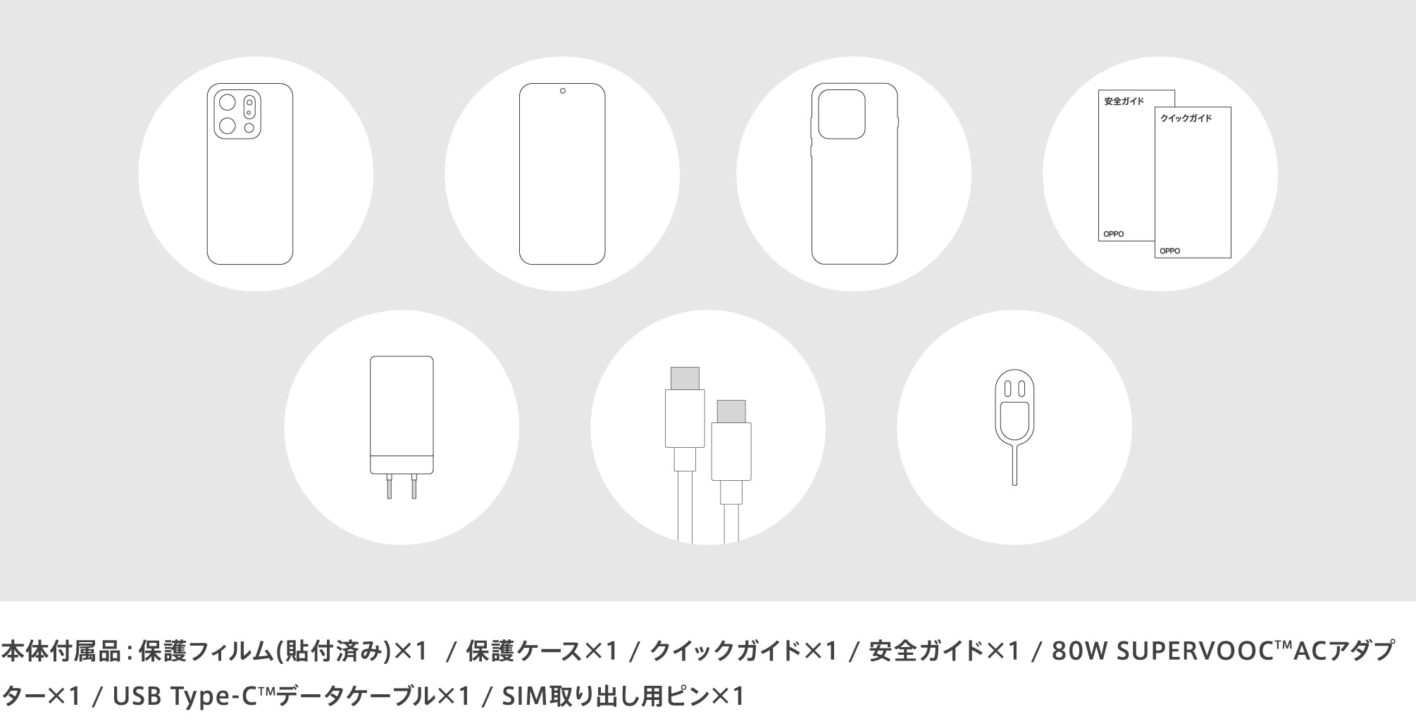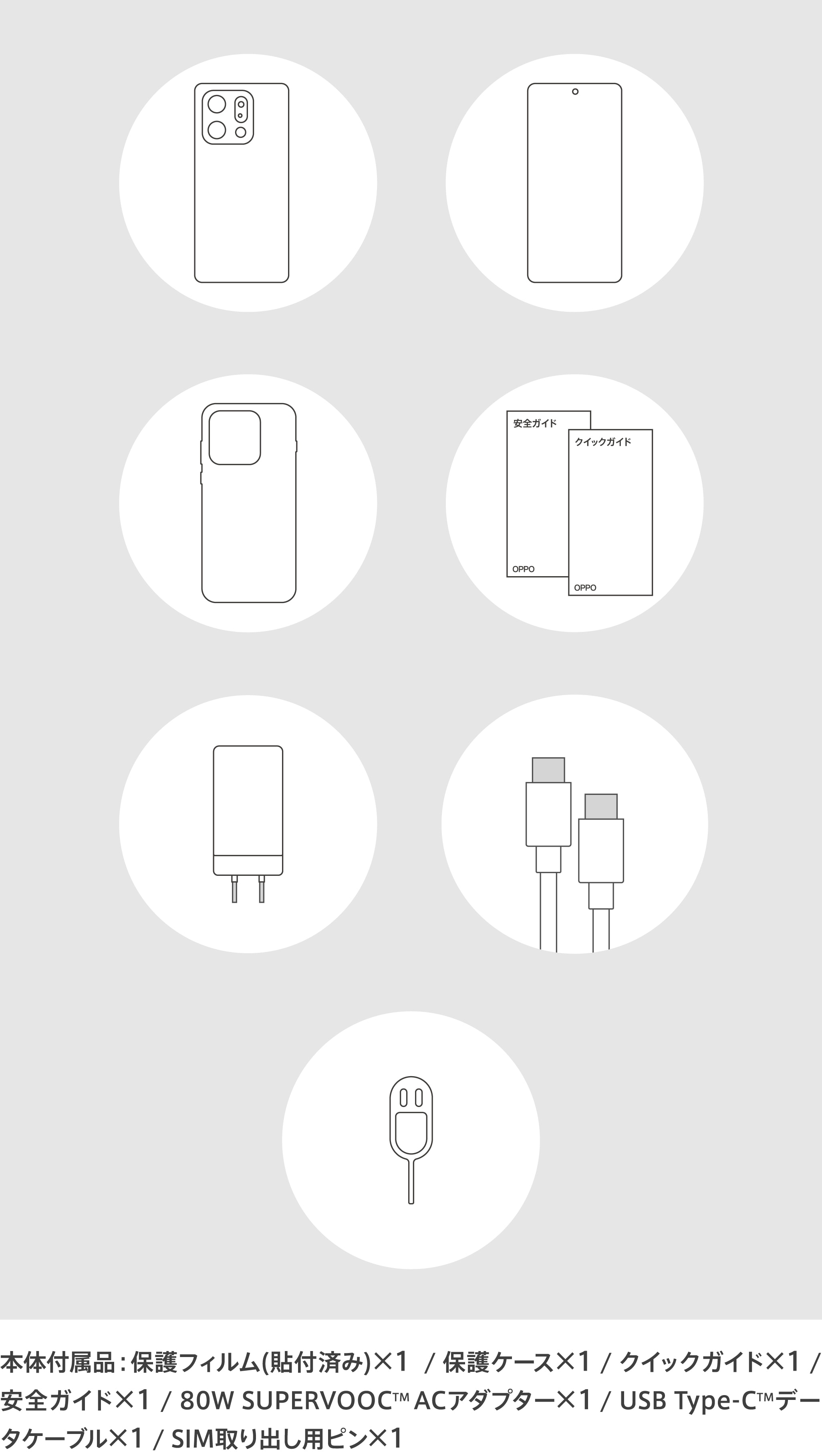| 本体付属品 | 保護フィルム(試供品)(貼付済み) / SIM取出し用ピン(試供品) / 保護ケース(試供品) / 80W SUPERVOOC™ ACアダプタ―(試供品) / USB Type-C™データケーブル(試供品) / クイックガイド / 安全ガイド |