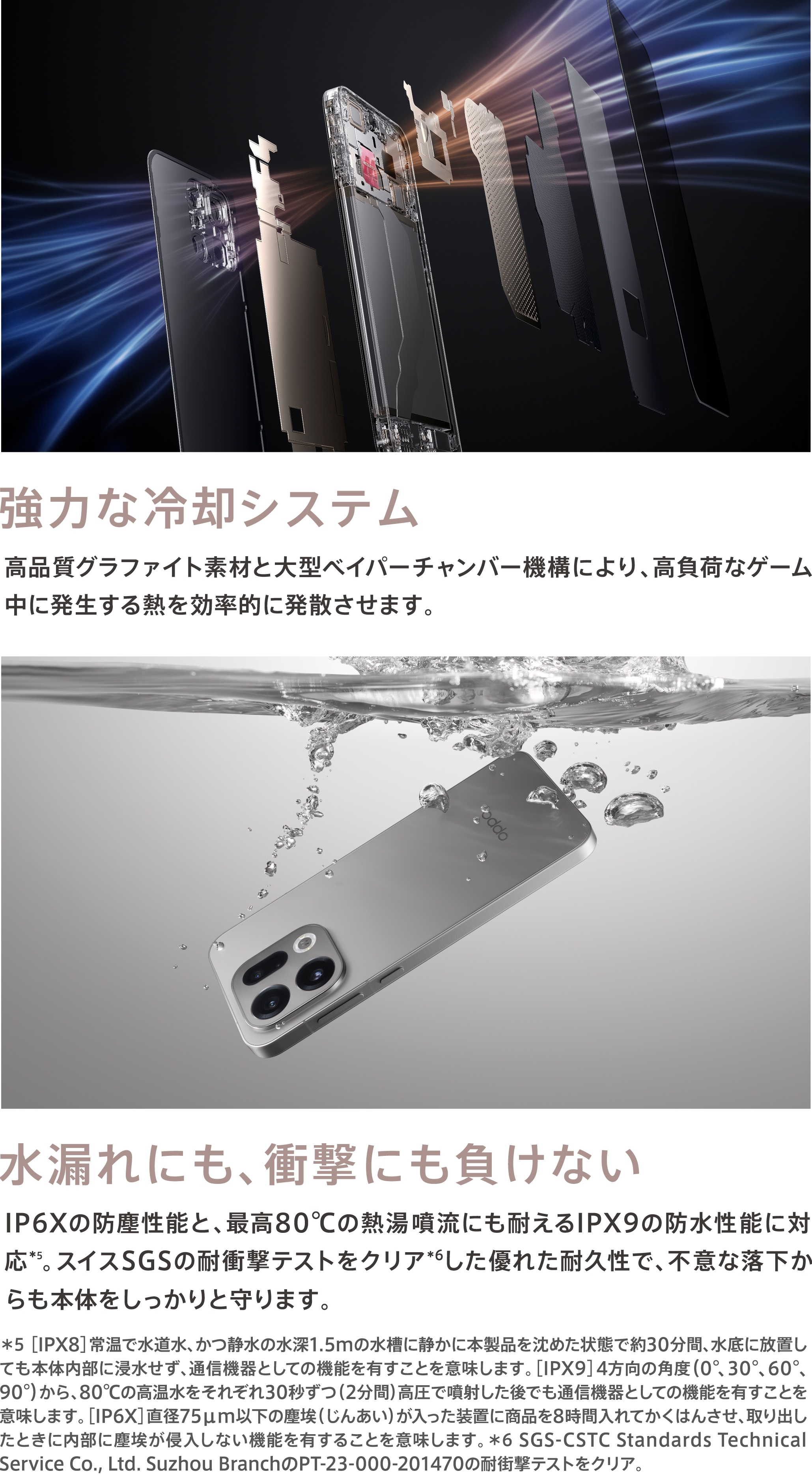 ・[IPX8]常温で水道水、かつ静水の水深1.5mの水槽に静かに本製品を沈めた状態で約30分間、水底に放置しても本体内部に浸水せず、通信機器としての機能を有すことを意味します。[IPX9]4方向の角度(0°、30°、60°、90°)から、80℃の高温水をそれぞれ30秒ずつ(2分間)高圧で噴射した後でも通信機器としての機能を有すことを意味します。[IP6X]直径75μm以下の塵埃(じんあい)が入った装置に商品を8時間入れてかくはんさせ、取り出したときに内部に塵埃が侵入しない機能を有することを意味します。