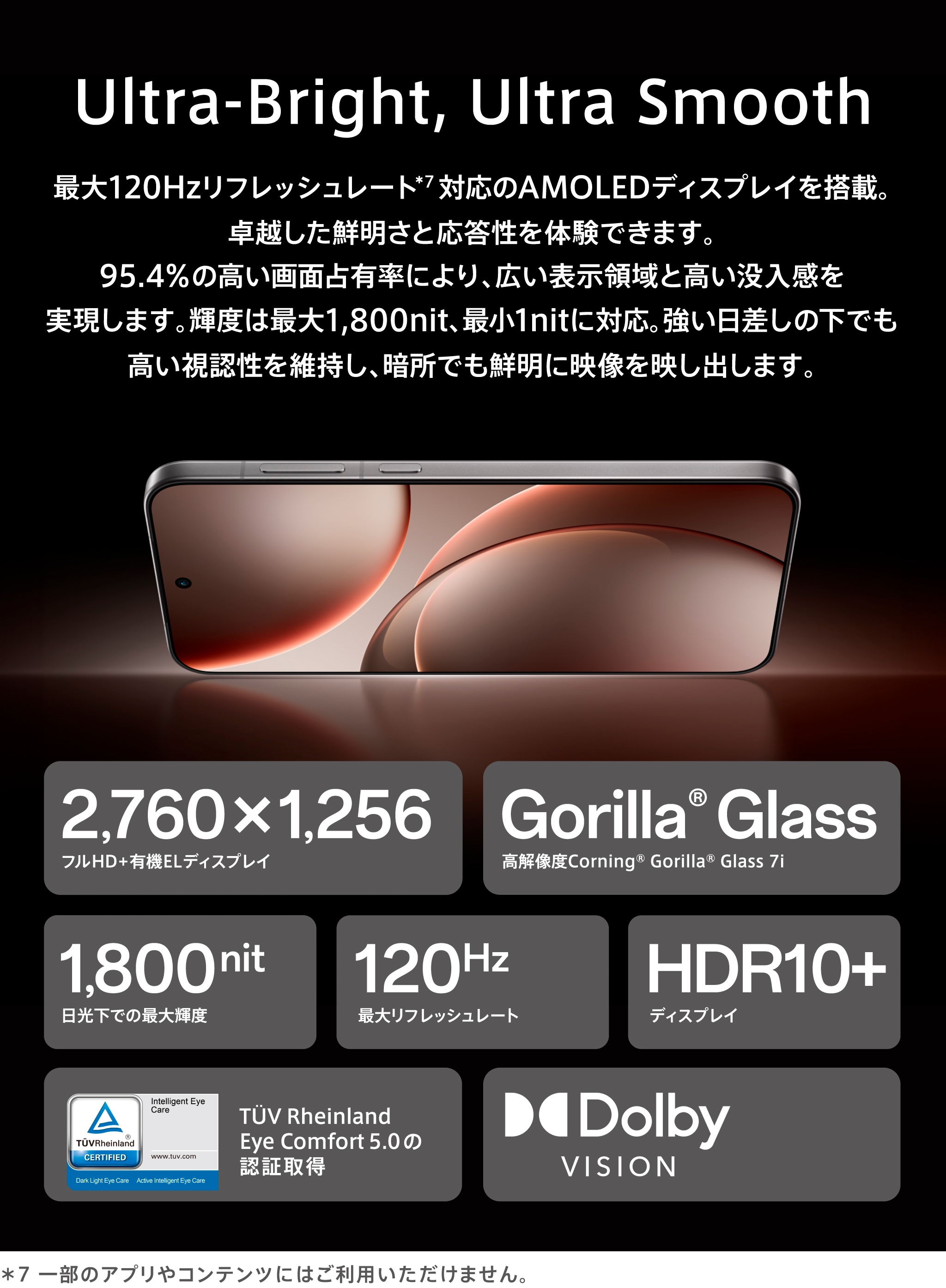 ・画面は最大120Hzリフレッシュレートをサポートしています。一部のアプリやコンテンツには対応していません。
